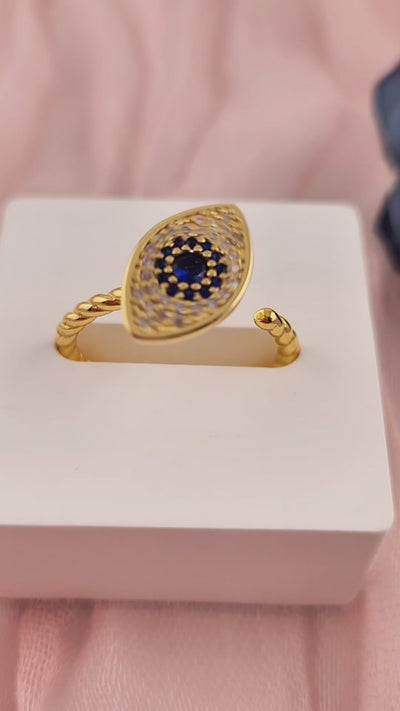 This fully adjustable gold plated s925 fidget spinning evil eye ring features a single statement evil eye at its centre, designed to be both eye-catching and functional.