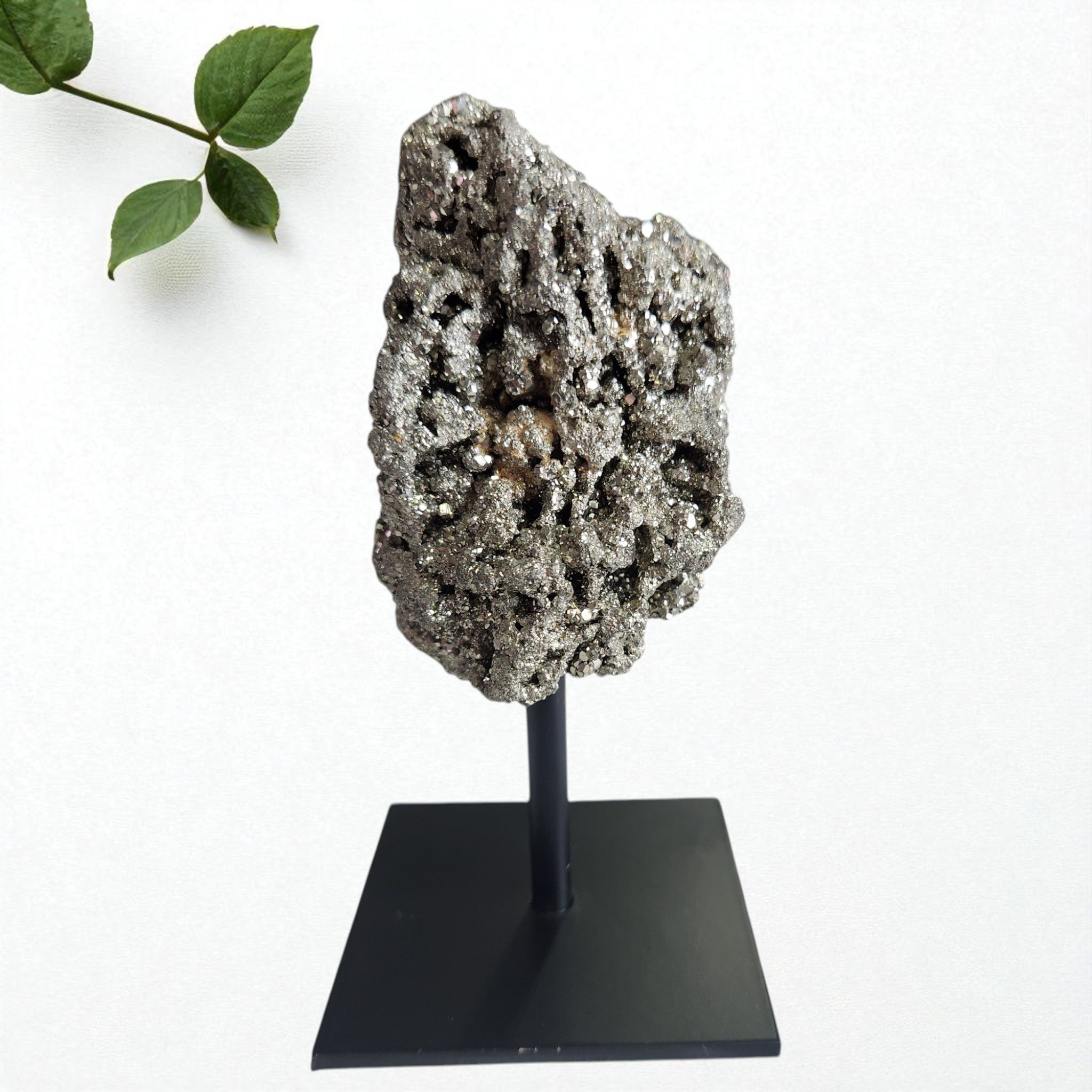 This carving features metallic golden pyrite shaped into a sleek sphinx cat, symbolising protection and strength. The polished finish highlights pyrite’s natural sparkle and bold metallic tones, making it a striking and unique collector’s piece.