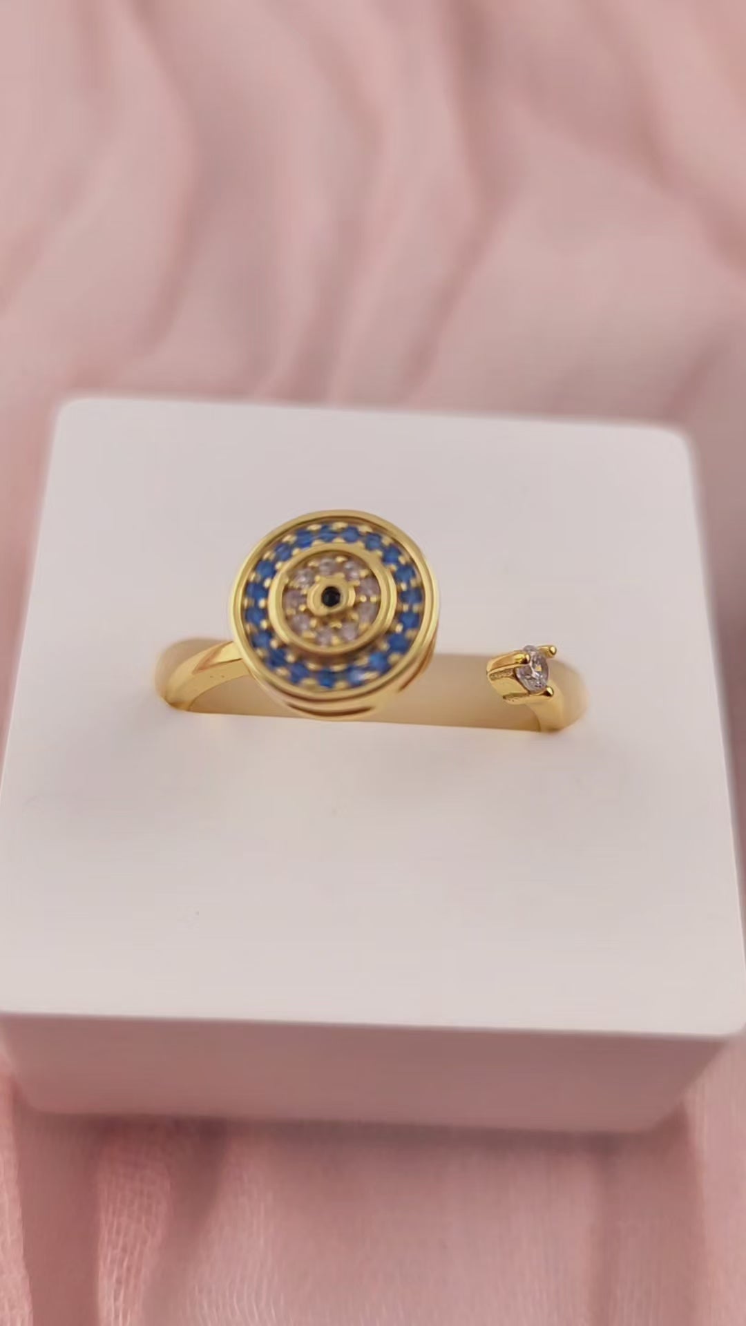 This gold plated S925 fully adjustable fidget spinning evil eye ring features a single statement evil eye at its centre, designed to be both eye-catching and functional.