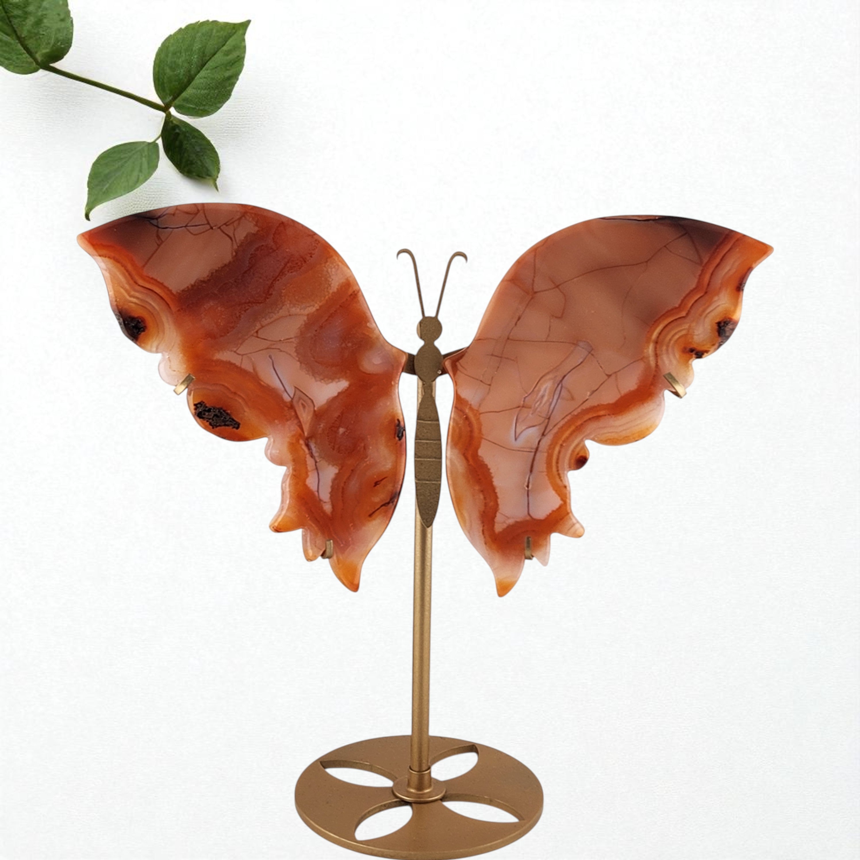 This red agate moss agate double terminated point features a mix of deep red tones and green moss-like patterns flowing through clear quartz. The rich red colour is often enhanced through dyeing to bring out the red agate colour and contrast.